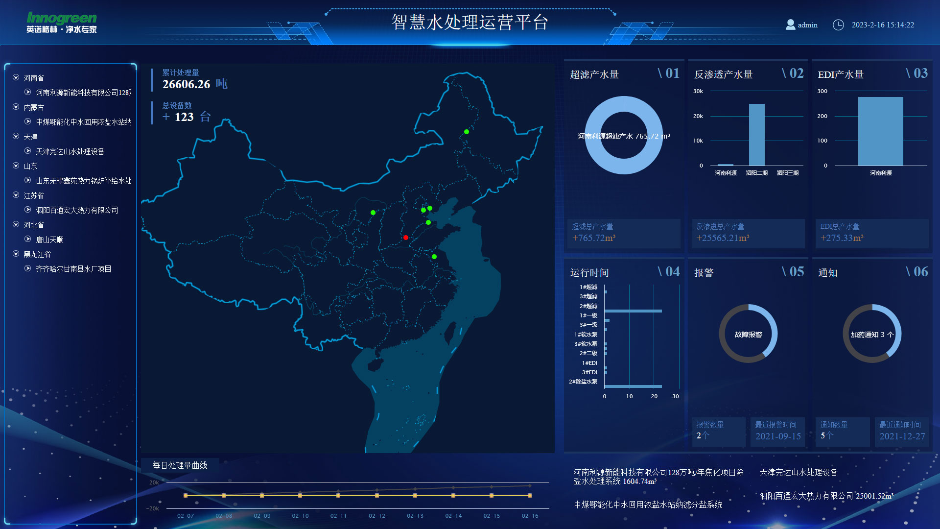 英諾格林云平臺(tái)通過(guò)物聯(lián)網(wǎng)模塊技術(shù),將全國(guó)各地接入的項(xiàng)目設(shè)備運(yùn)行數(shù)據(jù)和參數(shù)集成在云端數(shù)據(jù)中心平臺(tái),實(shí)現(xiàn)運(yùn)營(yíng)數(shù)據(jù)實(shí)時(shí)監(jiān)控、設(shè)備診斷、能耗分析、程序維護(hù)和故障報(bào)警等功能,同時(shí)集成設(shè)備的日常運(yùn)營(yíng)管理。英諾格林全國(guó)20多個(gè)滲濾液運(yùn)營(yíng)項(xiàng)目已實(shí)現(xiàn)遠(yuǎn)程在線監(jiān)控管理的智慧運(yùn)營(yíng),也可以為客戶設(shè)備提供遠(yuǎn)程監(jiān)控和售后管理服務(wù)。英諾格林設(shè)備云平臺(tái)的上線,讓大型水處理設(shè)備運(yùn)營(yíng)項(xiàng)目智慧高效,運(yùn)營(yíng)成本大幅優(yōu)化。